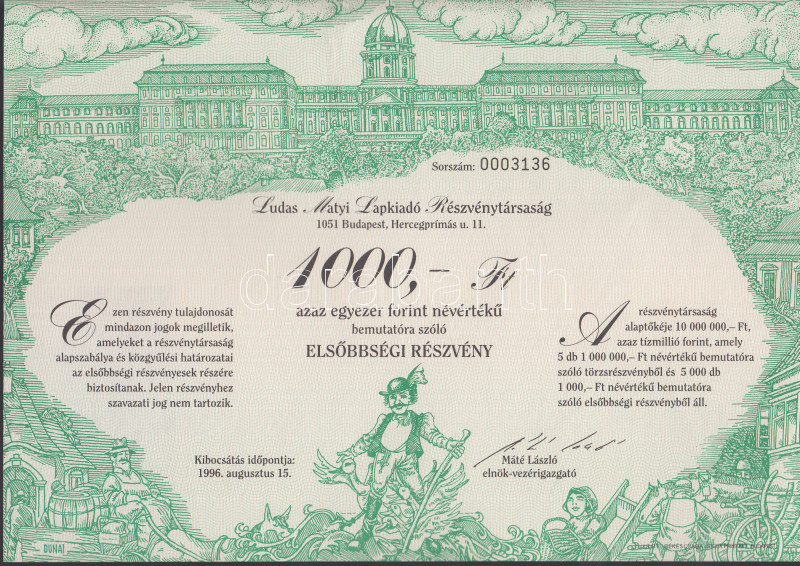 1996. "Ludas Matyi Lapkiadó Részvénytársaság" 1000Ft elsőbbségi részvé...