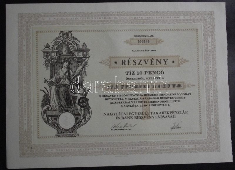 https://www.darabanth.com/en/168-Online-auction/168.0/Numismatics/Shares-and-Tickets~2000351/Nagyleta-1939-Nagyletai-Egyesult-Takarekpenztar-es-Bank-Reszvenytarsasag-reszvenye-1~II561723
