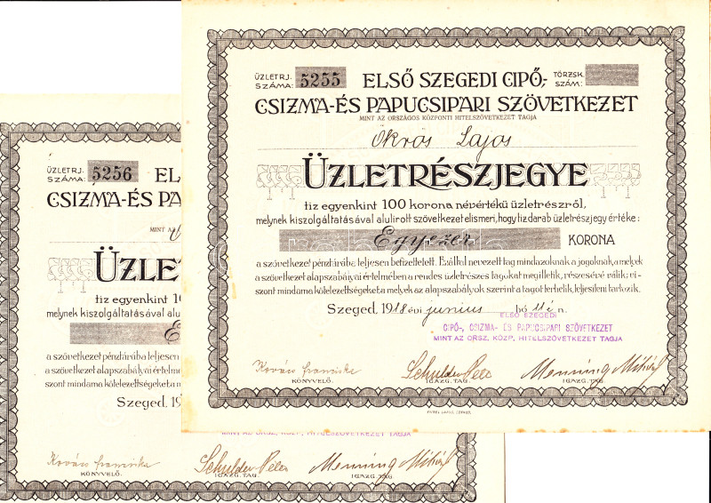 Szeged 1918. "Első Szegedi Cipő-, Csizma- és Papucsipari Szövetkezet" ... https://www.darabanth.com/en/168-Online-auction/168.0/Numismatics/Shares-and-Tickets~2000351/Szeged-1918-Elso-Szegedi-Cipo--Csizma-es-Papucsipari-Szovetkezet-uzletreszjegye-1000K-ro~II561617
