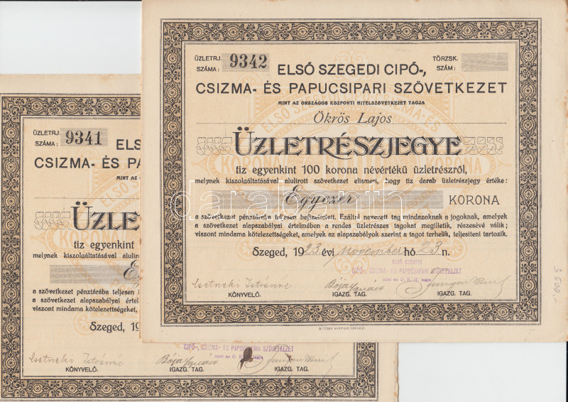 Szeged 1923. "Első Szegedi Cipő-, Csizma- és Papucsipari Szövetkezet" üzletrészjegye 1000K-ról (2x) egymás utáni sorszámmal, szép állapotban
