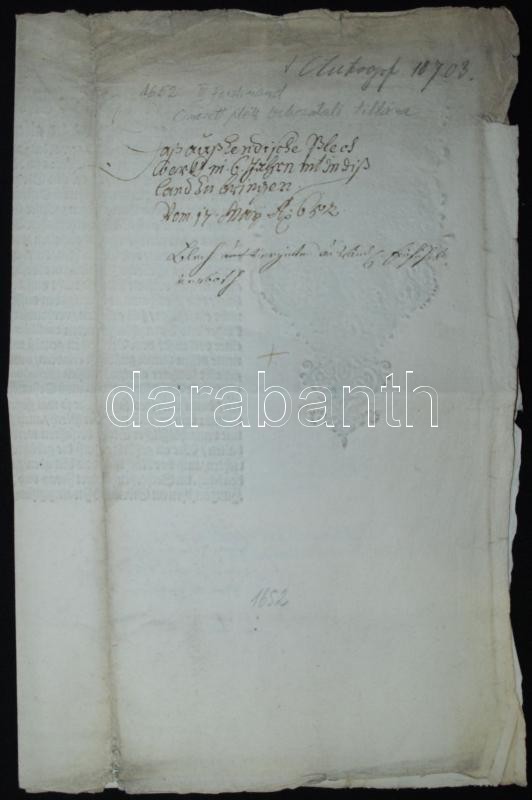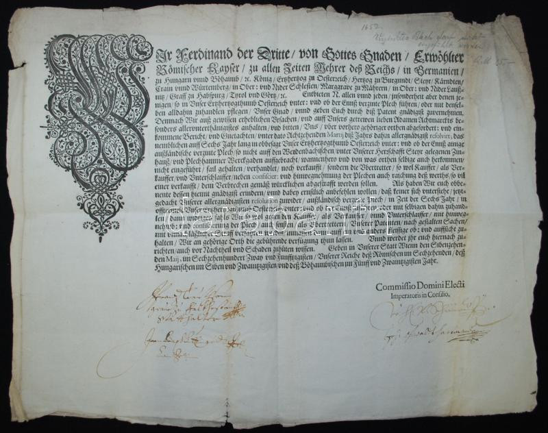 1652 III. Ferdinánd rendelete a cinezett pléh behozatalának tilalmáról... https://www.darabanth.com/en/168-Online-auction/168.0/Other-collectibles/Historical-documents-manuscripts~500026/1652-III-Ferdinand-rendelete-a-cinezett-pleh-behozatalanak-tilalmarol-alairasokkal--3Cbr~II561412