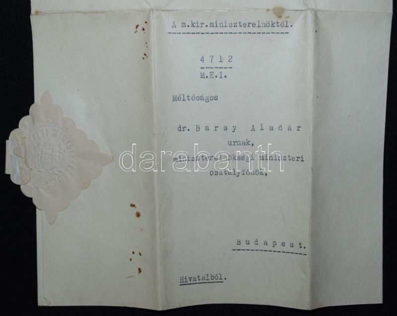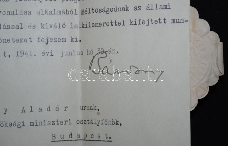 1941 Okirat Bárdossy László miniszterelnök sajét kezű aláírásával, Bar...