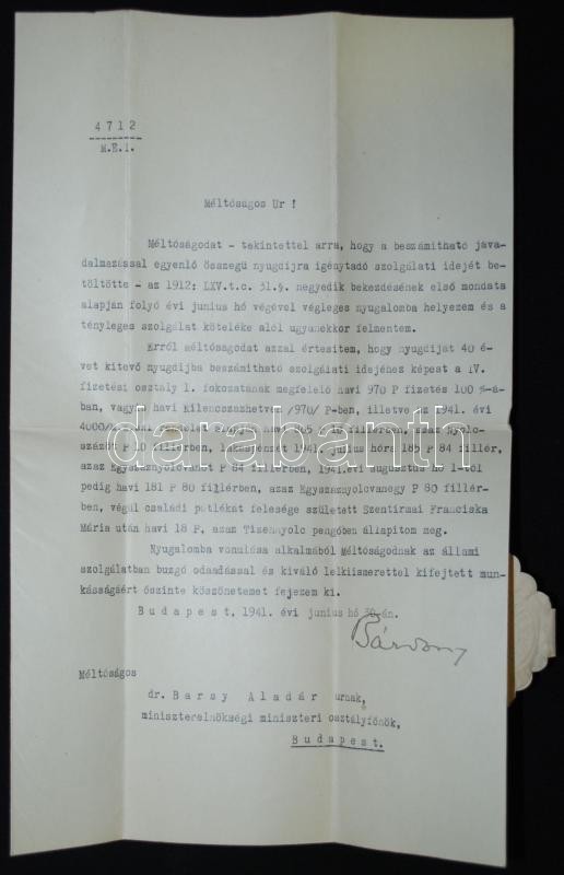 1941 Okirat Bárdossy László miniszterelnök sajét kezű aláírásával, Barsy Aladár miniszteri tanácsos nyugdíjba helyezéséről