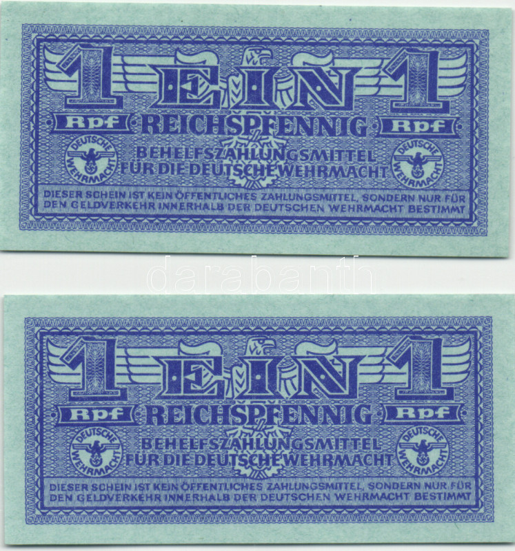 Német 3.Birodalom/Deutsche Wehrmacht (Német Véderő) 1942. 1RPf kék (2x... https://www.darabanth.com/en/169-Online-auction/169.0/Numismatics/Foreign-banknotes~4000132/Nemet-3BirodalomDeutsche-Wehrmacht-Nemet-Vedero-1942-1RPf-kek-2x-TI-3Cbr3EGerman-Third-R~II546087