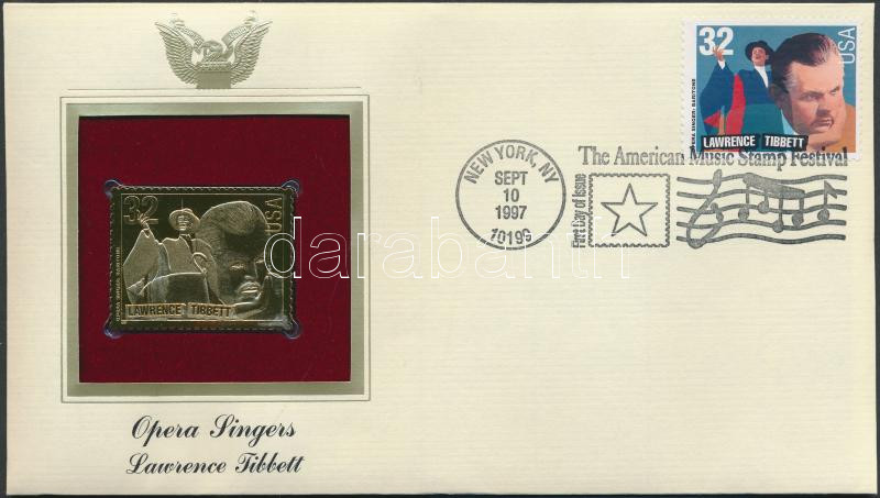 Description: Amerikai Egyesült Államok 1997. "Operaénekesek/Lawrence Tibbett 32c" aranyfóliás(22kt) bélyeg replika FDC borítékban, a megegyező bélyeggel,elsőnapi bélyegzővel és ismertetővel T:1