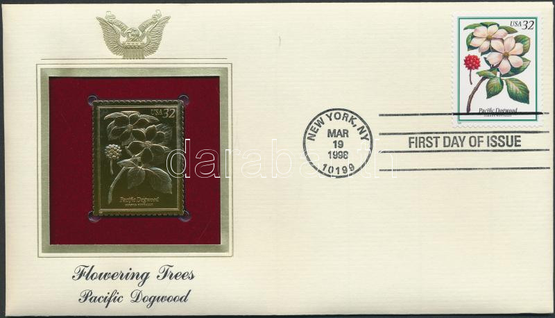 Description: Amerikai Egyesült Államok 1998. "Virágzó fák/Cornus nuttallii 32c" aranyfóliás(22kt) bélyeg replika FDC borítékban, a megegyező bélyeggel,elsőnapi bélyegzővel és ismertetővel T:1