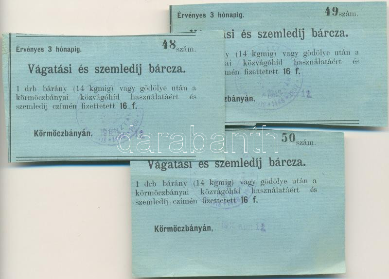 1915 Körmöcbánya vágatási és szemledíj bárca (3x), egymás utáni sorszámmal, pecséttel és dátumbélyegzővel ellátva! T:I,II