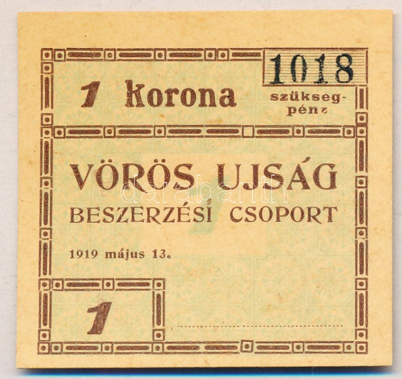 https://www.darabanth.com/en/169-Online-auction/169.0/Numismatics/Hungarian-and-foreign-emergency-notes-and-coins-tokens~4000127/Budapest-Voros-Ujsag-1919-1K-nyomdai-hibas-vizszintes-kozepkeret-negyzeteben-pont-hia~II569275