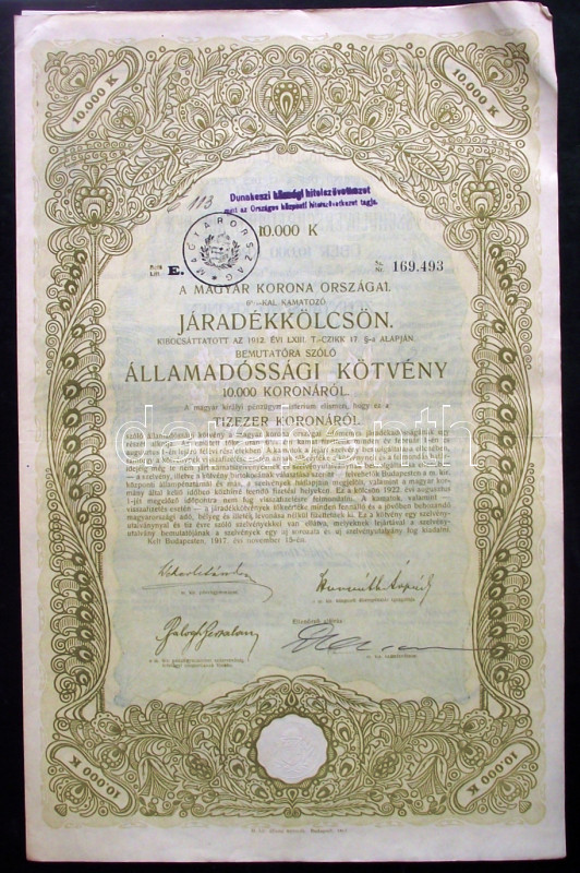 1917. A Magyar Korona Országai 6%-kal kamatozó Járadékkölcsön- államad... https://www.darabanth.com/en/169-Online-auction/169.0/Numismatics/Shares-and-Tickets~4000126/1917-A-Magyar-Korona-Orszagai-625-kal-kamatozo-Jaradekkolcson-allamadossagi-kotvenye-10~II543681