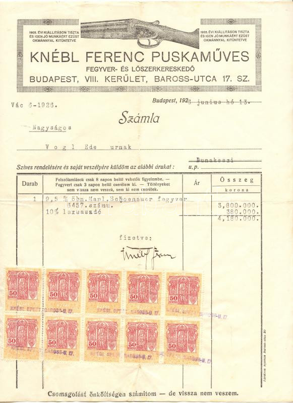 1926 Knébl Ferenc puskaműves díszes fejléces számlája 10db illetékbély...