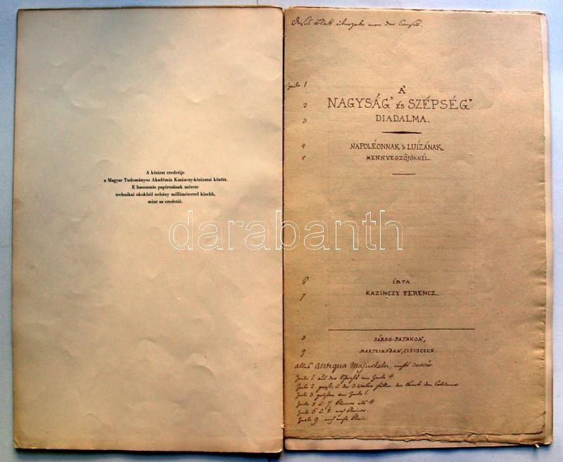 Kazinczy Ferenc: A' nagyság' és szépség' diadalma Napol... https://www.darabanth.com/en/169-Online-auction/169.0/Other-collectibles/Books-Other-rarities~4000038/Kazinczy-Ferenc-A-nagysag-es-szepseg-diadalma-Napoleonnak-es-Maria-Lujzanak-menyegzoje~II538126