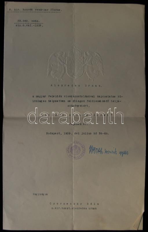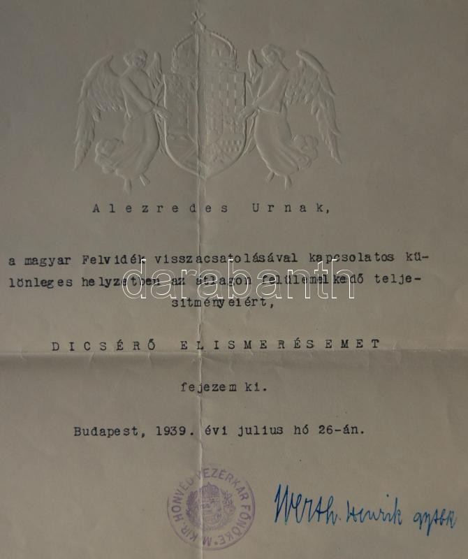 https://www.darabanth.com/en/169-Online-auction/169.0/Other-collectibles/Documents~4000014/1939-Felvideki-emleklap-Werth-Henrik-a-Magyar-Kiralyi-Honvedseg-vezerkari-fonokenek-alair~II549174