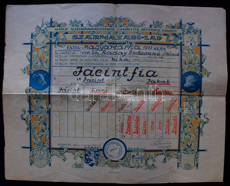https://www.darabanth.com/en/169-Online-auction/169.0/Other-collectibles/Documents~4000014/1942-Alfoldi-Szarvasmarhatenyeszto-Egyesuletek-Szovetsege-oklevel-50x40-cm~II519769