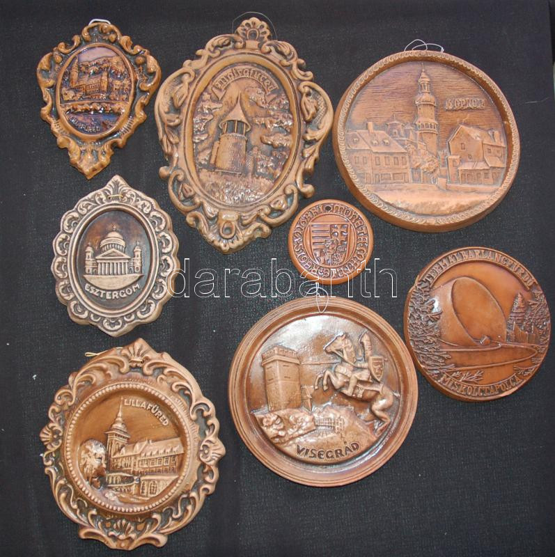 Description: 8db, különböző magyarországi városokat (Esztergom, Lillafüred, Mátrafüred, Miskolctapolca, Sopron, Visegrád), illetve Mátyás-kori címert ábrázoló kerámiaplakett