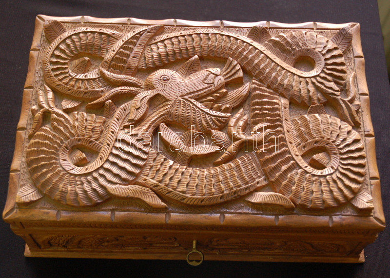Sárkánnyal díszített nagyméretű faragott fa ékszeres doboz jó állapotb...