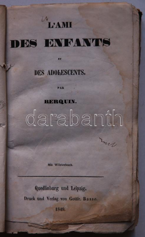 Description: Berquin: L'ami des enfants et des adolescents. Mit Wörterbuch. Quedlinburg - Leipzig, 1849, Gottfried Basse. Viseltes kiadói félvászon kötésben, belül foltokkal és ceruzás jegyzetekkel, az előzéklapon a tulajdonos bejegyzésével és ragasztással /