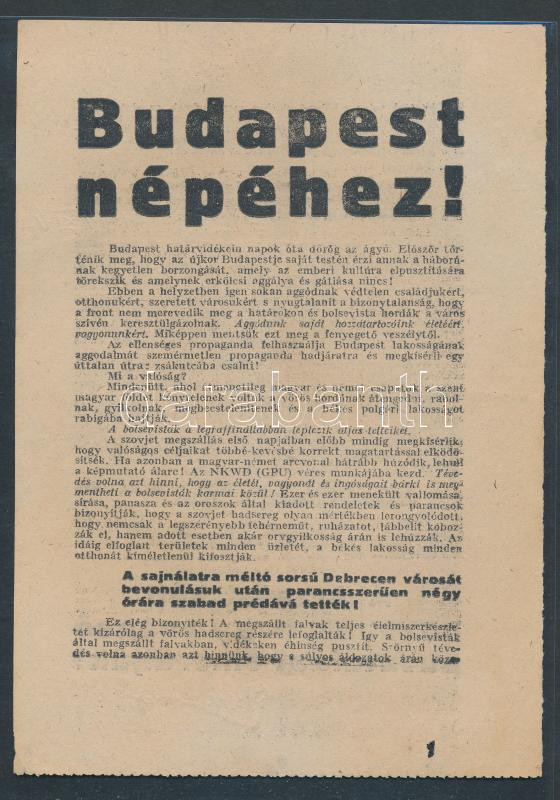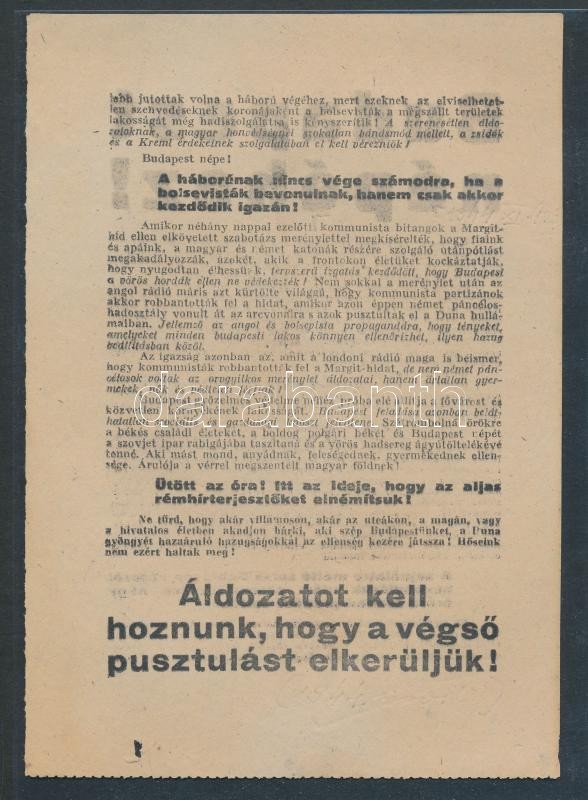 1944 Budapest népéhez c. antibolsevista, kitartásra felszólító röplap jó állapotban