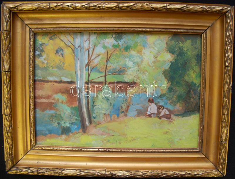 Jelzés nélkül: Folyóparton, olaj, papír, 30×35 cm, üvegezett keretben