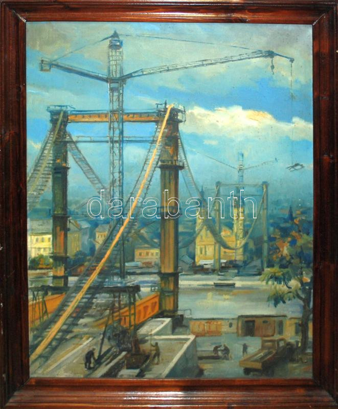 Mór József (1908-?): Az Erzsébet híd újjáépítése, olaj, vászon, jelzet...