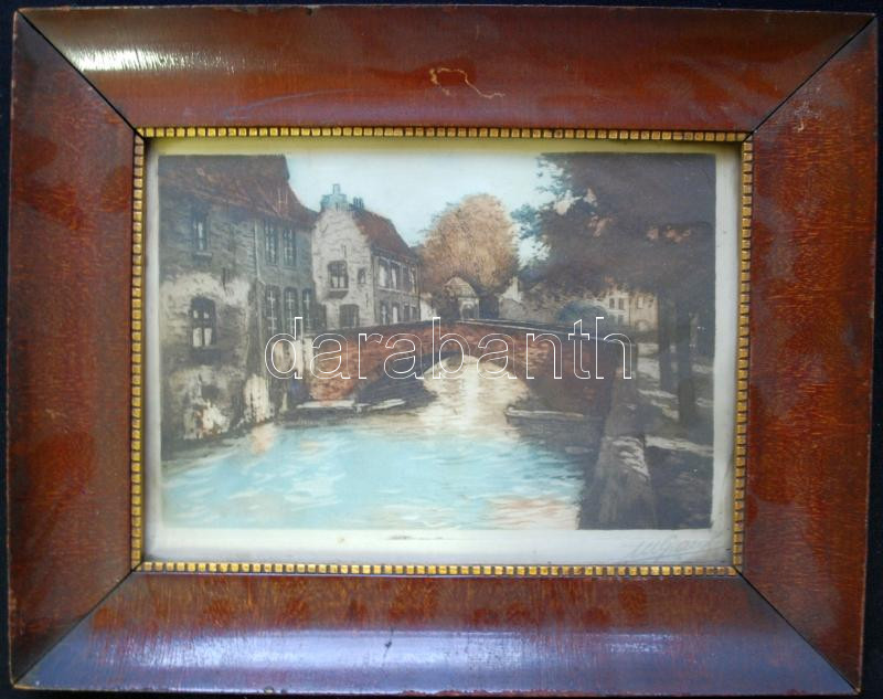 Olvashatatlan jelzéssel: Brugge, színezett rézkarc, papír, üvegezett keretben, kerettel 24×30 cm