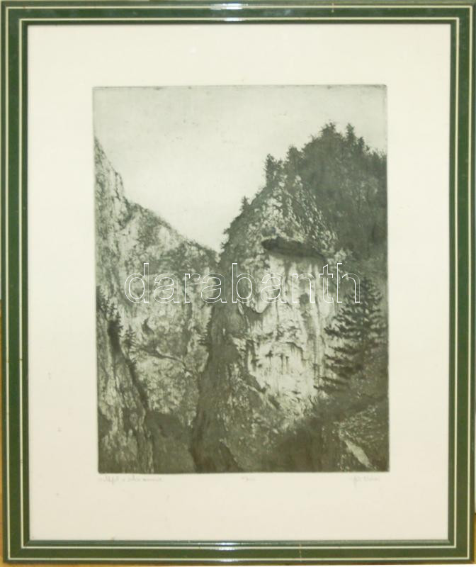 Sipos István (1945): Sziklafal a Békás szorosnál. rézkarc- papír, üve...