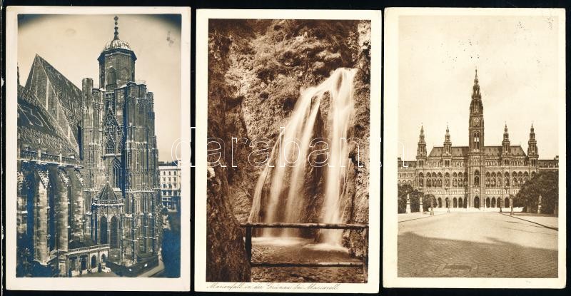 18 db régi, ausztriai városképes lap és egy 12 darabos képeslapos füze...