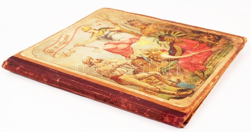 Description: Az öt világrész. Kihuzható képeskönyv 20 szinezett képpel. (Chromolitográfiák.) Bp. cca. 1880. Riegler J. E. Papírneműgyára. 44p. + 5 x 4 chromolith. tábla; kihajtható. Kiadói félvászon-kötésben. Komplett, a táblák megragasztva