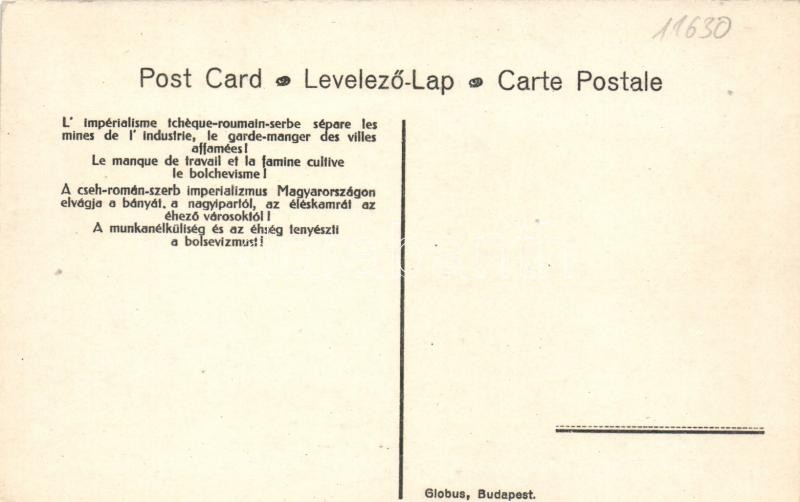 1919 'A cseh-román-szerb imperializmus Magyarországon elvágja a bányát... https://www.darabanth.com/en/17-Major-auction/17.1/Thematic-postcards/Irredenta~5533/1919-A-cseh-roman-szerb-imperializmus-Magyarorszagon-elvagja-a-banyat-a-nagyipartol-az-ele~II793759