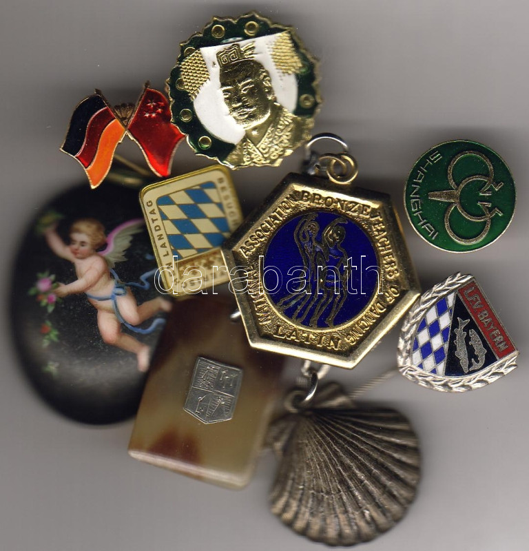 12 db kül. kitűző, medál, pecsétgyűrű, jelvény, stb. régi szivarkás fé...