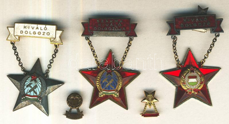 ~1950. "Szakma Kiváló Dolgozója" bordó sorszámozott zománcozott kitüntetés + "Kiváló Dolgozó" fehér-világoskék zománcozású kitüntetés miniatűrrel + ~1960. "Kiváló Dolgozó" kitüntetés miniatűrrel + Az építőipar kiváló dolgozója miniatűr T:2,2-
