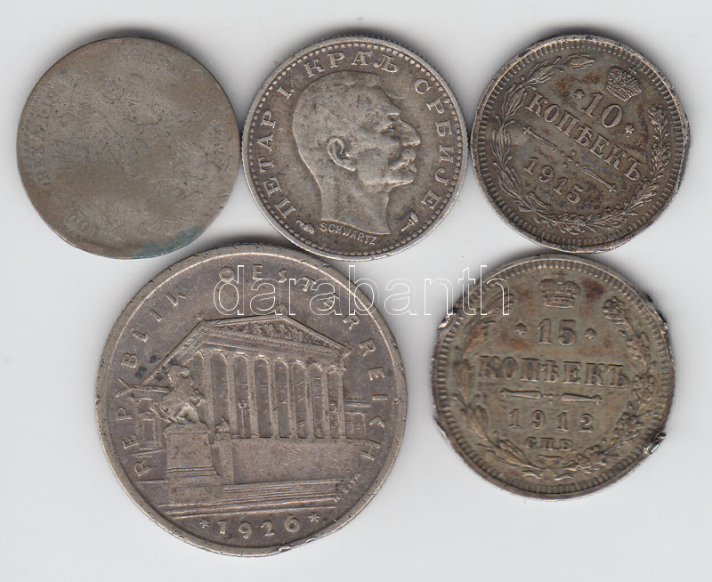 Description: Ausztria 1926. 1Sch Ag + 10Kr Ag + Oroszország 1912. 15k Ag + 1915. 10k Ag + Szerbia 1915. 50P Ag T:2,2-,3,5