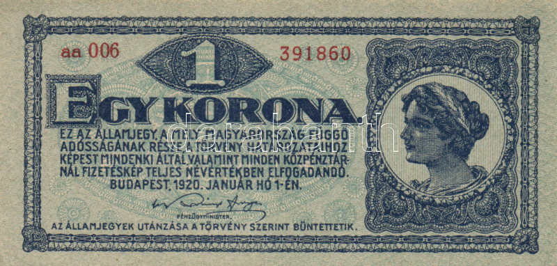 1920. 1K piros "aa" sor és sorozatszám (3x) egymás utáni sorszámokkal T:I-,II