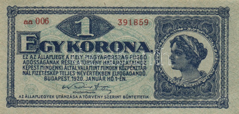 1920. 1K piros "aa" sor és sorozatszám (3x) egymás utáni sorszámokkal ...