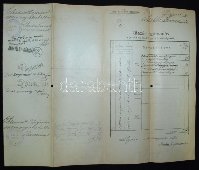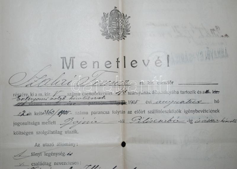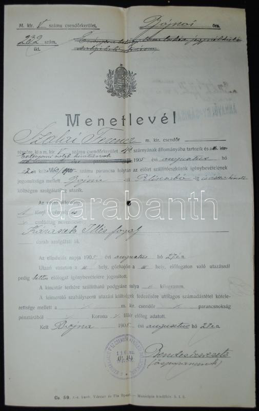 https://www.darabanth.com/en/170-Online-auction/170.0/Other-collectibles/Documents~500020/1905-Csendor-menetlevel-es-utazasi-szamadas-Bajna-Piliscsaba~II572446