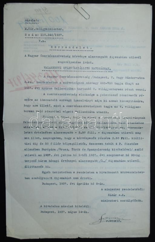 1937 Magyar Cserkész Szövetségnek küldött belügy minisztériumi körrend...