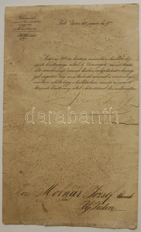 1871 Molnár József festőművészt a Londoni Nemzetközi Kiállítás kitünte... https://www.darabanth.com/en/170-Online-auction/170.0/Other-collectibles/Historical-documents-manuscripts~500021/1871-Molnar-Jozsef-festomuveszt-a-Londoni-Nemzetkozi-Kiallitas-kituntetesrol-ertesito~II491552