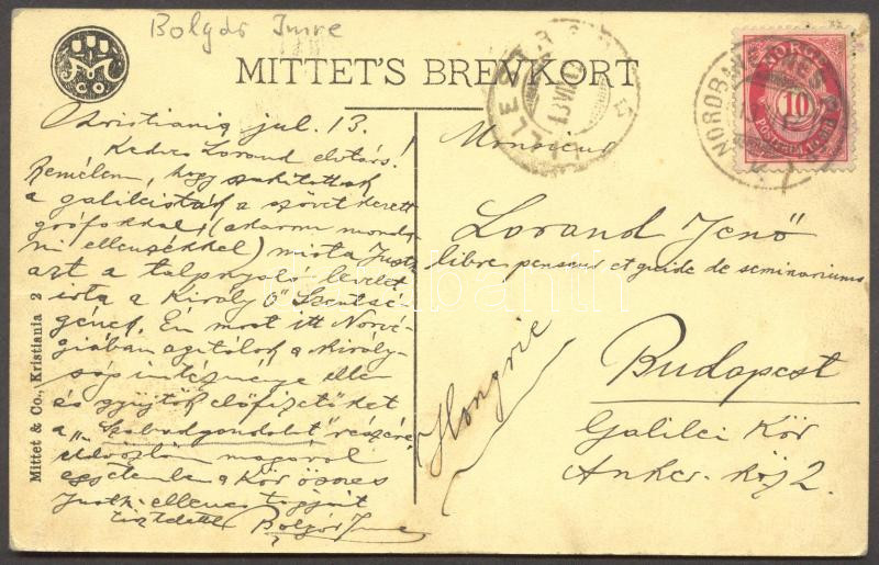 1913 Bolgár Imre író érdekes, politikai tartalmú képeslapja Lóránd Jenőnek Norvégiából. /