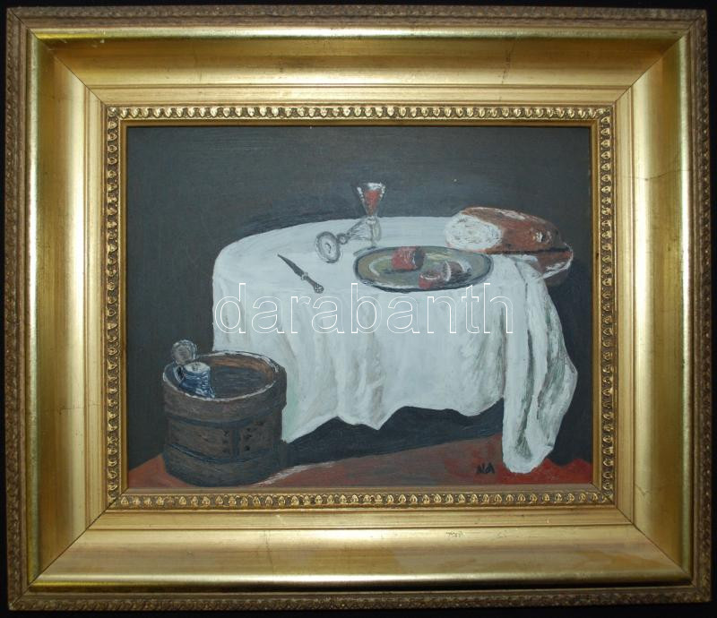 NA jelzéssel: Asztali csendélet, olaj, farost, szép kerettel 31×37 cm