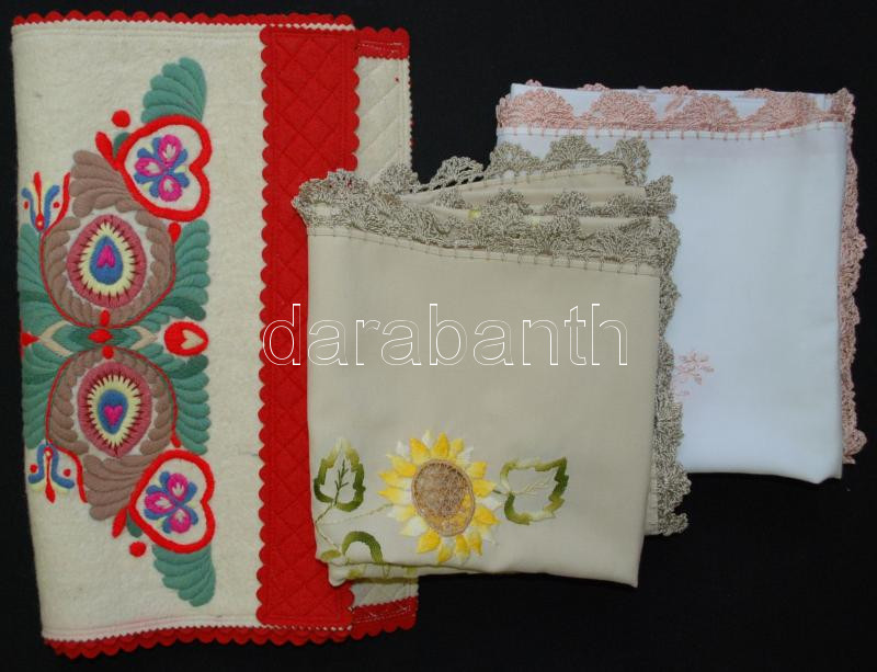 AsztalterÃtÅ‘ tétel 3 db: Napraforgó-mintás kézzel hÃmzett asztalterÃtÅ‘ 90x90cm, kézzel hÃmzett asztalterÃtÅ‘ 90x90cm, kézzel hÃmzett népi motÃvumokkal dÃszÃtett asztalterÃtÅ‘ filcbÅ‘l 38x90cm