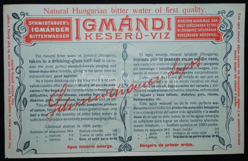 Két nyelvű igmándi keserűvíz reklám, angol-spanyol