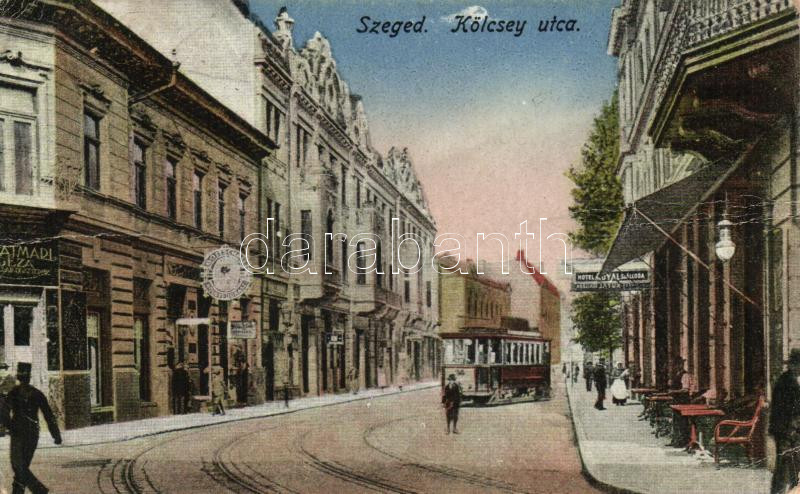 Szeged Kölcsey utca, Royal Szálloda, Gotschall hölgyfodrászat, Szatmári Géza divatüzlete, villamos