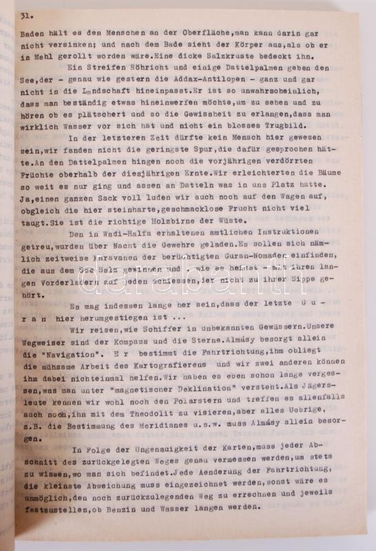 Description: cca 1938 Széchenyi Zsigmond: Hengergő homok c. vadász és útikönyvének kiadatlan német nyelvű fordítása. gr. Pálffy Móric nyugalmazott követ gépi kézirata. A fordítás nem jelent meg. Keménykötésben / German translation of world famous hunter and traveller Szechenyi Zsigmond: The wandering sand. Unpublished.