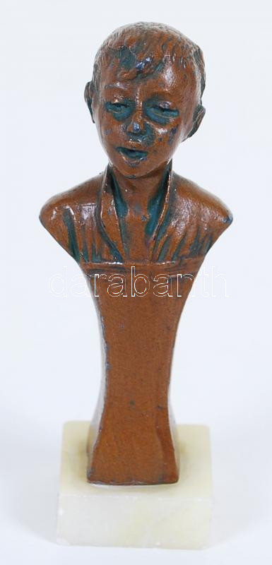 Description: cca 1920 Éneklő kisfiú szecessziós festett spiáter büsztje alabástrom talapzaton /