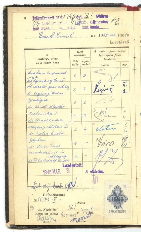 1945 Építészmérnök hallgató teljes leckekönyve sok aláírással