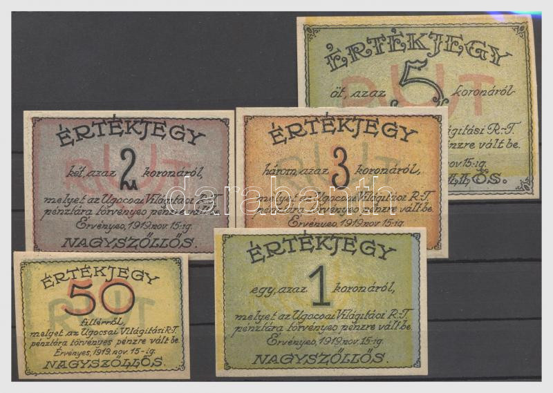 https://www.darabanth.com/en/174-Online-auction/174.0/Numismatics/Hungarian-and-foreign-emergency-notes-and-coins-tokens~2200139/Nagyszollos-1919-Ugocsai-Vilagitasi-Rt-ertekjegy-50f-1K-2K-3K-5K-TI~II597689