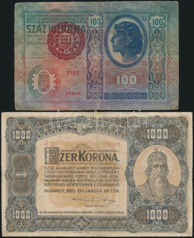 1912. 100K piros "Magyarország" felülbélyegzéssel + 1920. 1000K "Orell...