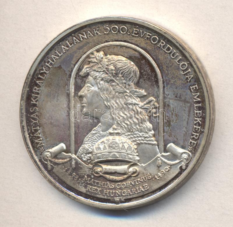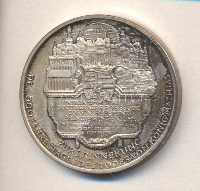 Description: Bozó Gyula (1913-2004) / Szabó Géza (1939-) 1990. "Mátyás király halálának 500. évfordulója emlékére" Ag(0.900/36,12g emlékérem (42,5mm) eredeti dísztokban T:PP