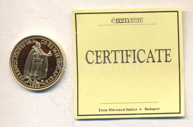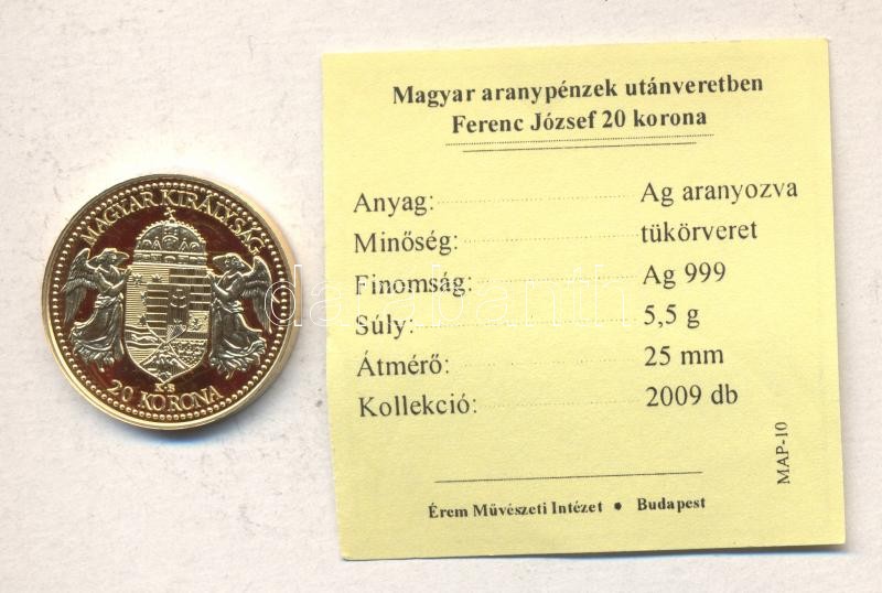 "Magyar aranypénzek utánveretben - Ferenc József 20 korona" aranyozott Ag(0.999) emlékérem (5.5g) T:PP csak 2009db! Tanúsítvánnyal