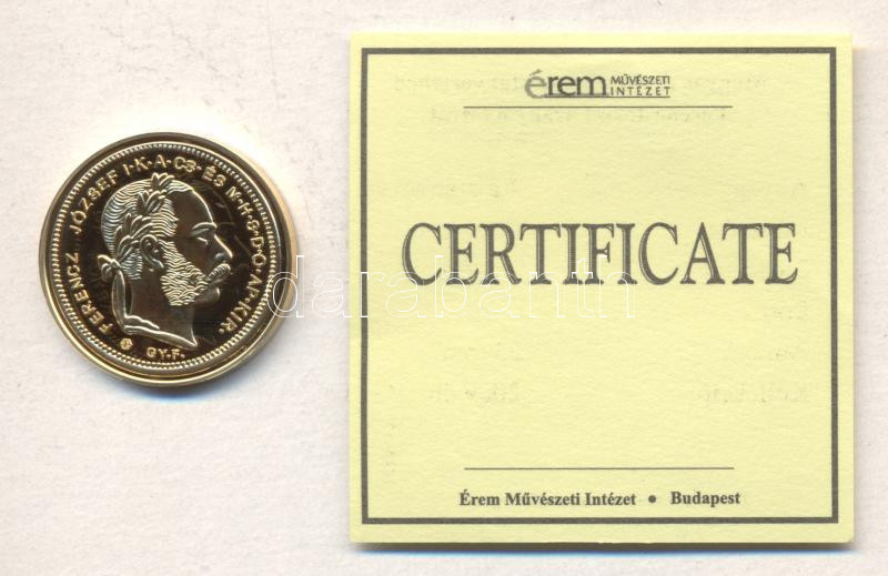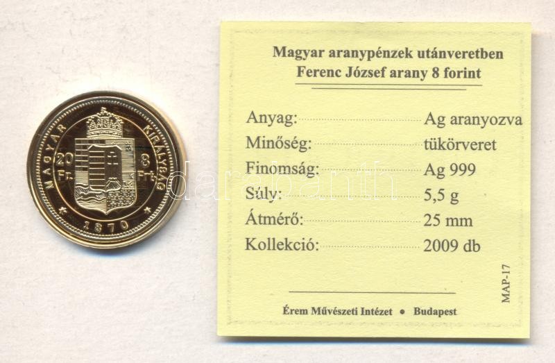 "Magyar aranypénzek utánveretben - Ferenc József arany 8 forint" aranyozott Ag emlékérem (5.5g) T:PP csak 2009db! Tanúsítvánnyal