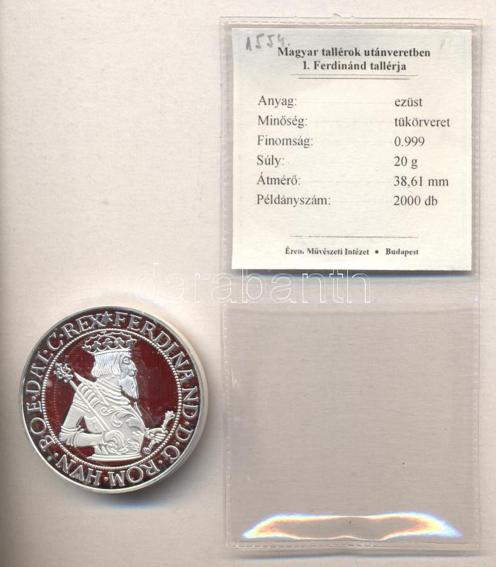 Magyar tallérok utánveretben "I. Ferdinánd Tallérja 1554." Ag (0,999) 20g T:PP Tanúsítvánnyal, csak 2000db!